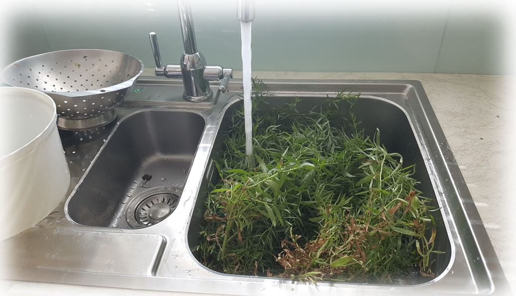 Of course, I don’t get to just observe. Today, as well as the Basil, we had to crop Oregano, Thyme, and Tarragon. The Dill, which we cut before we went away, has failed to regenerate for a second crop and the Marjoram has died completely. It was my job to cut and strip the Oregano and the Tarragon. It is a laborious and time-consuming activity and I was glad when it was over. In the meantime, Pauline was stripping the Thyme and cutting the Basil.