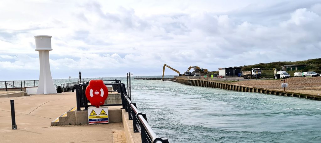 When we parked on Littlehampton Marina Parade, we noticed that dredging was going on at the point that the River Arun meets the English Channel. Tons/tonnes of gravel were being extracted and loaded on to lorries to be taken away.