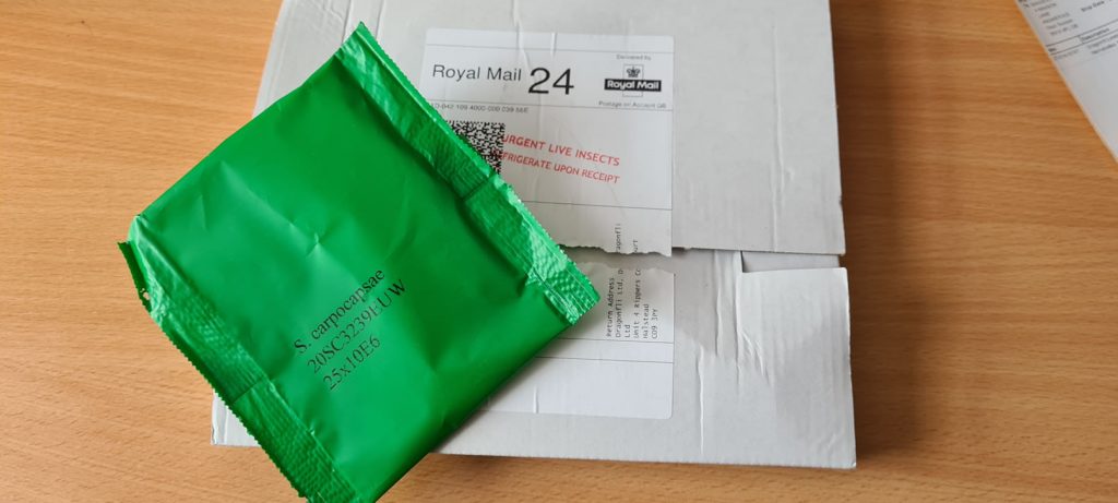 After two days in the fridge, my silent killers have been taken out and warmed up. I was surprised that they were embedded in a white, soluble matting. They are then diluted with water and sprayed across the grass. This has to be done when the grass has been scarified, is wet and not in full sun but at a minimum of 12C/54F soil temperature.….. I hope you’re keeping up.