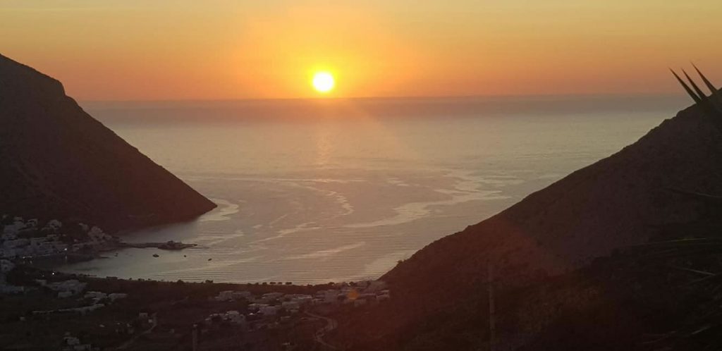 Her husband and her sons work there as well as running the small farm just up the mountain from where our house was situated. Moshca is pictured with a damaged leg. Wonder what she’s done? She is sitting on the verandah of their farm house looking over the valley to the port of Kamares and the sunset.