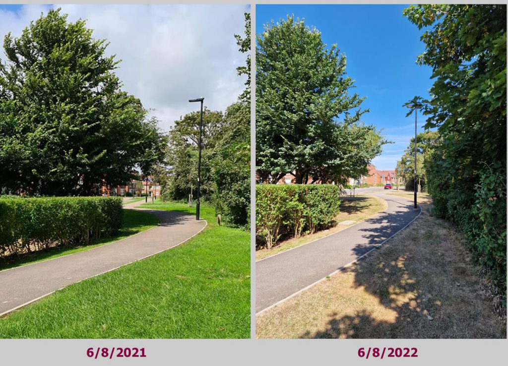 Gloriously hot and sunny day. Lovely shopping, wonderful walking and gorgeous gardening all linked by strong sunshine. A hosepipe ban is exactly one week away. Grass areas all along our walk are brown and dry. The comparison with last year is quite stark.