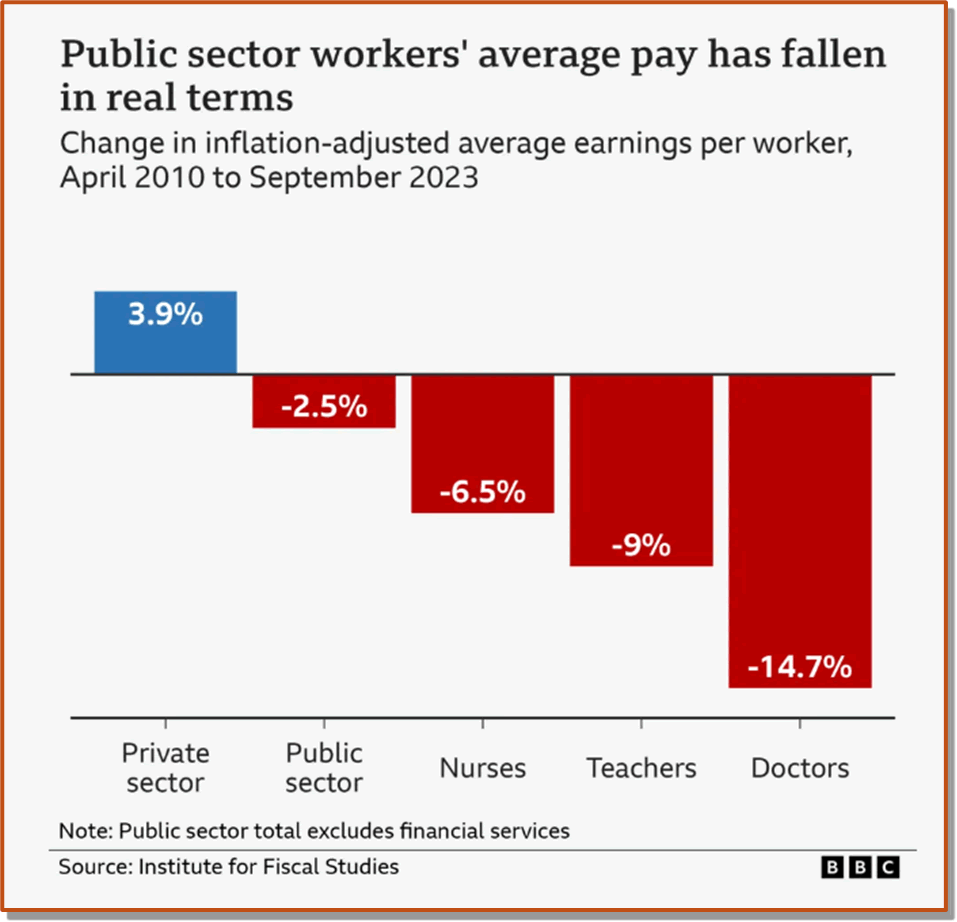 As this graph starkly illustrates, we could not have retired at a more fortunate time, economically speaking. Since 2010, Teachers’ Pay has declined by 9% (inflation adjusted) while Teachers’ Pensions have increased by 20%. There are reasons to be cheerful, Dear Reader. Things can only get better and they will.