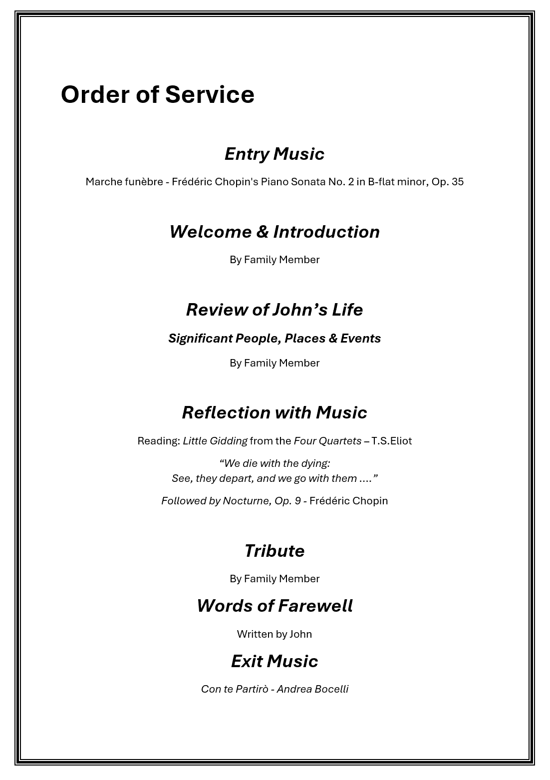 I will be incinerated and scattered to the winds. I don’t want to inconvenience anyone although I will insist on forcing those who have featured in my life to live up to their responsibilities. No one will feel subsequently responsible. I have no children living. I do not want my wife to worry about my upkeep. All are invited to this fun party!