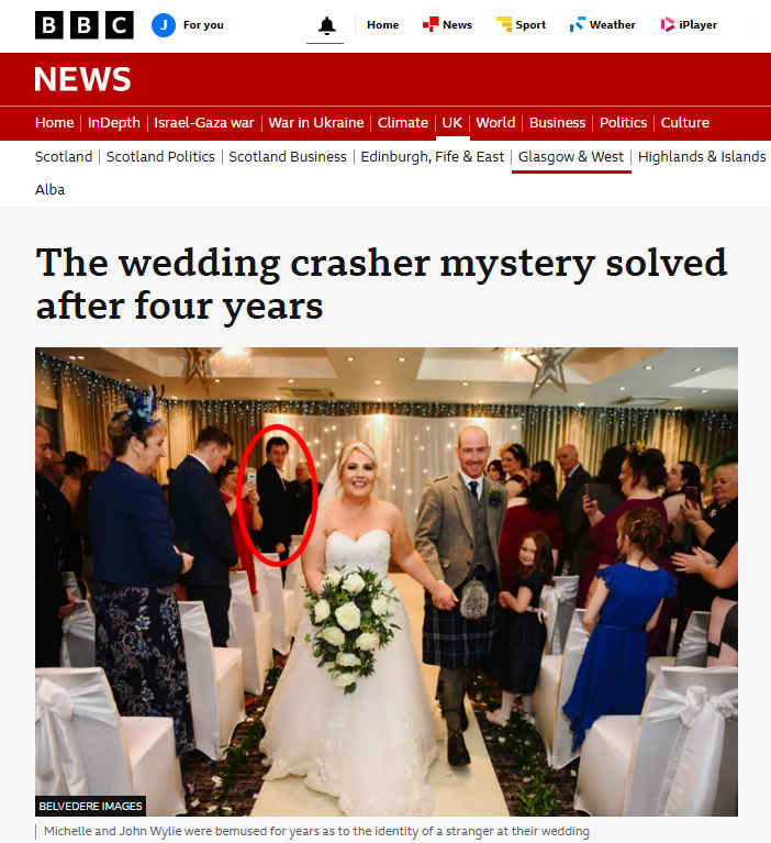 I was amused and heartened by a story on the BBC webpage which could easily be about me. It features a wedding in Scotland and the photographs taken on the day revealed the presence of a very tall mystery man. Nobody invited him and nobody knew who he was. Only when it was uploaded to the web did someone solve the mystery and name the gatecrasher. Apparently, he was expected at another wedding a couple of miles away but didn’t realise he was at the wrong wedding until the bride walked down the aisle. Well, Dear Reader, I could have been the mystery man who nobody invited and nobody knew …. at the wrong wedding.