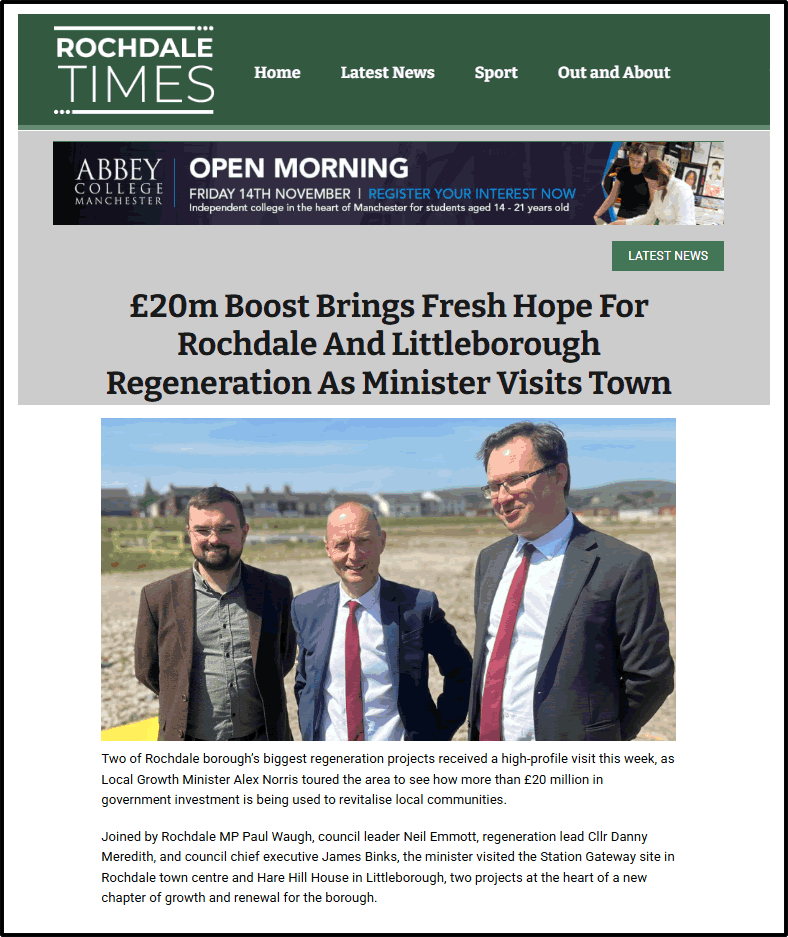 Consequently, Rochdale elected a proper Labour MP – a fantastic MP and respected journalist, Paul Waugh. Suddenly, Levelling Up becomes a reality. They have managed to negotiate a development pot of £20m to pour into the lowly, working class areas. I’m looking forward to seeing for myself.