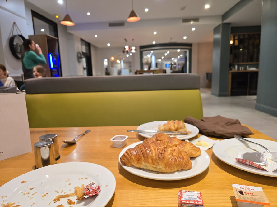 Breakfast at 7.30 am. Oh, don’t make me eat any more. My body isn’t accustomed to it. Usually, I have orange juice, tea and fresh coffee. Now, I’m eating croissants the size of mountains.