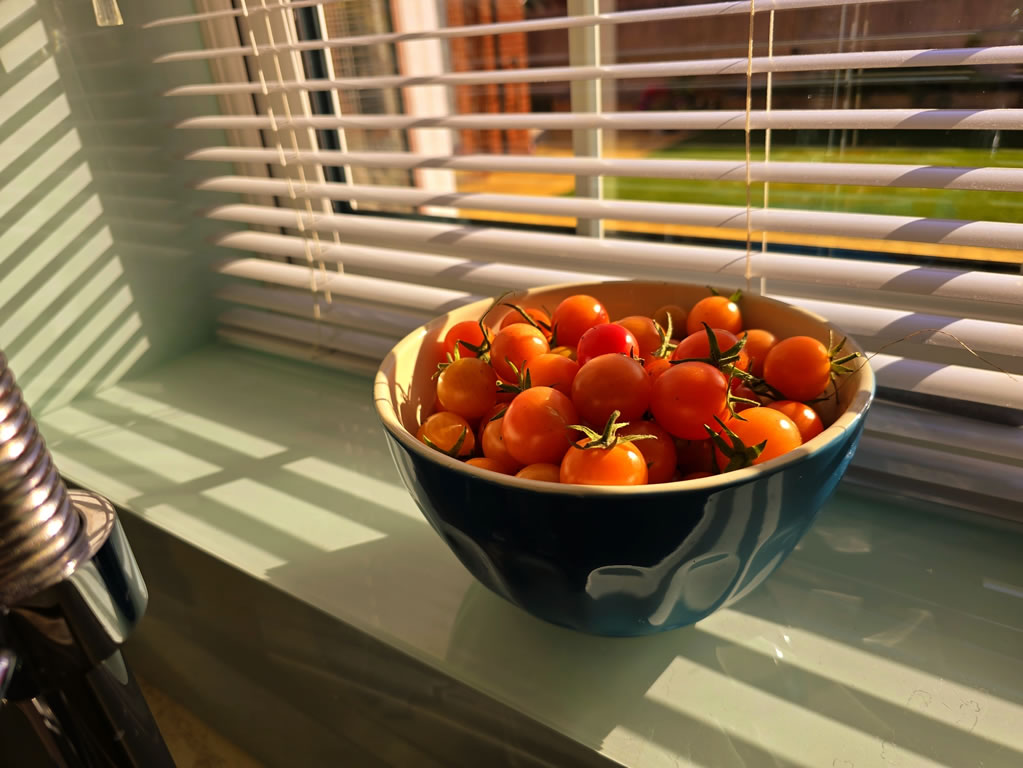 Gorgeous morning. Wonderful sunshine and blue sky. I’d only been away a few days but last night I picked another 1.5kg of cherry tomatoes from outside in the back garden. I continue to marvel at this productivity outside at the end of October.