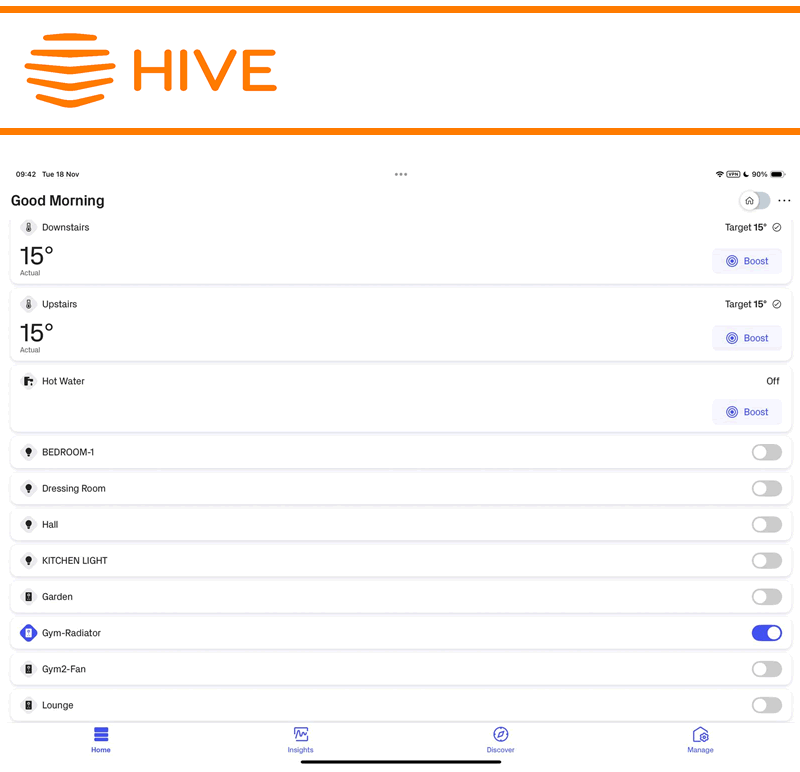 The list here which only shows the first list of rooms, doesn’t refer to individual heating. They are controlling the lighting and the heating and cooling of the Gym. You can’t see it on this first page but I have a fan next to my seat in my Office. Although it is easier just to reach out and switch it on/off manually, I have to use the control on my phone to get full satisfaction.
