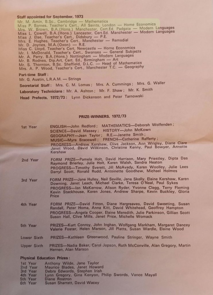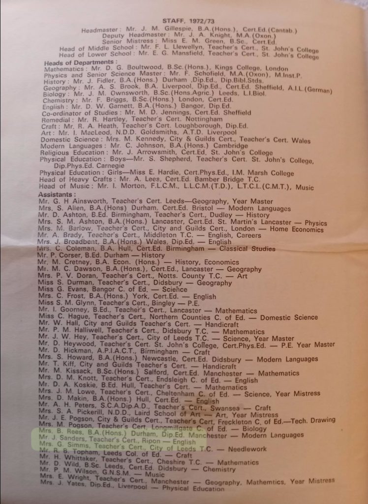 An ex-pupil provided this memory of the beginning of our school journey. I started in September 1972 and Pauline in September 1973. I always remember her arriving for interview. I was teaching a Year 11 class English as this gorgeous creature with long, blonde hair right down to her bottom walked past my open classroom door. I stopped speaking and stuck my head out to watch her walking up the corridor only to find two boys behind me doing exactly the same thing. At that point the die was cast in all sorts of ways.